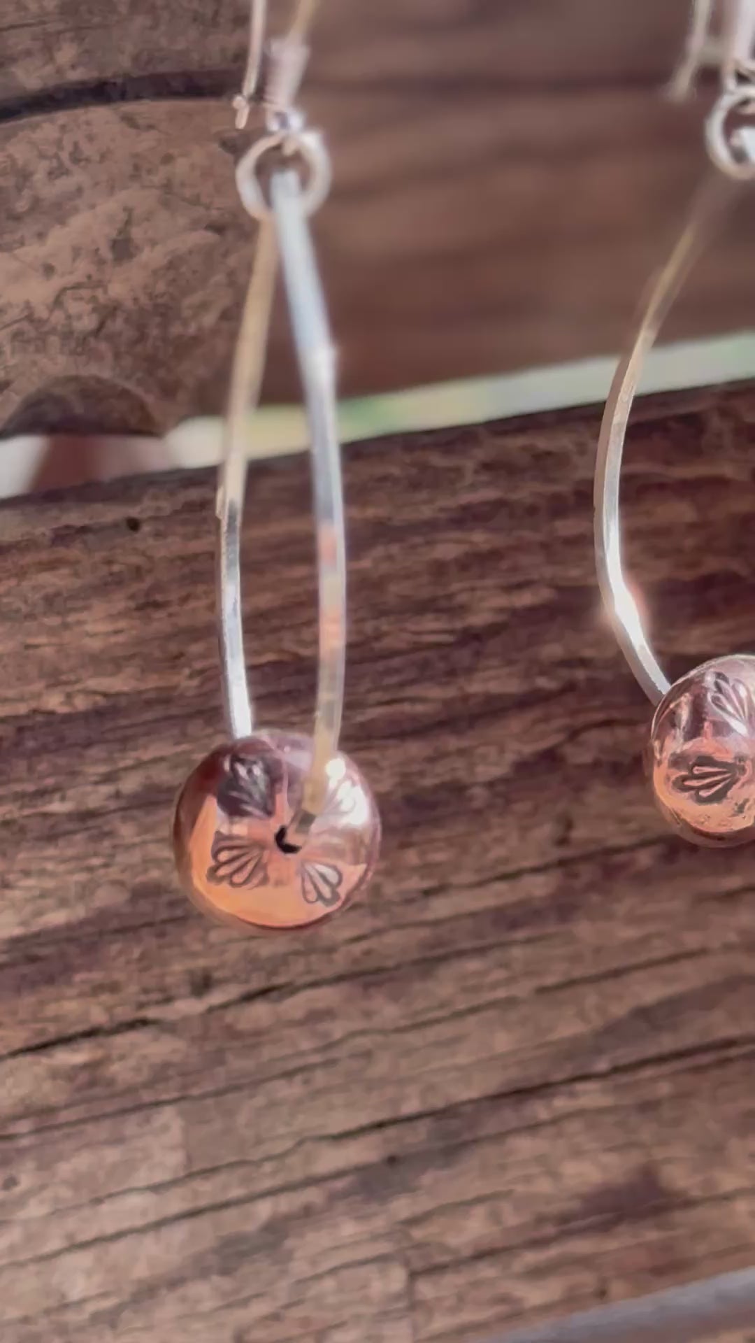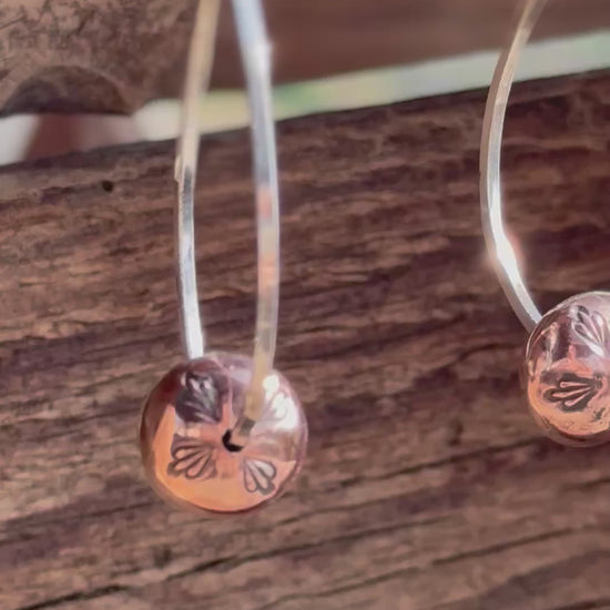 Hand stamped and built copper mountain pearls strung on square sterling silver wire. Sterling silver hooks.