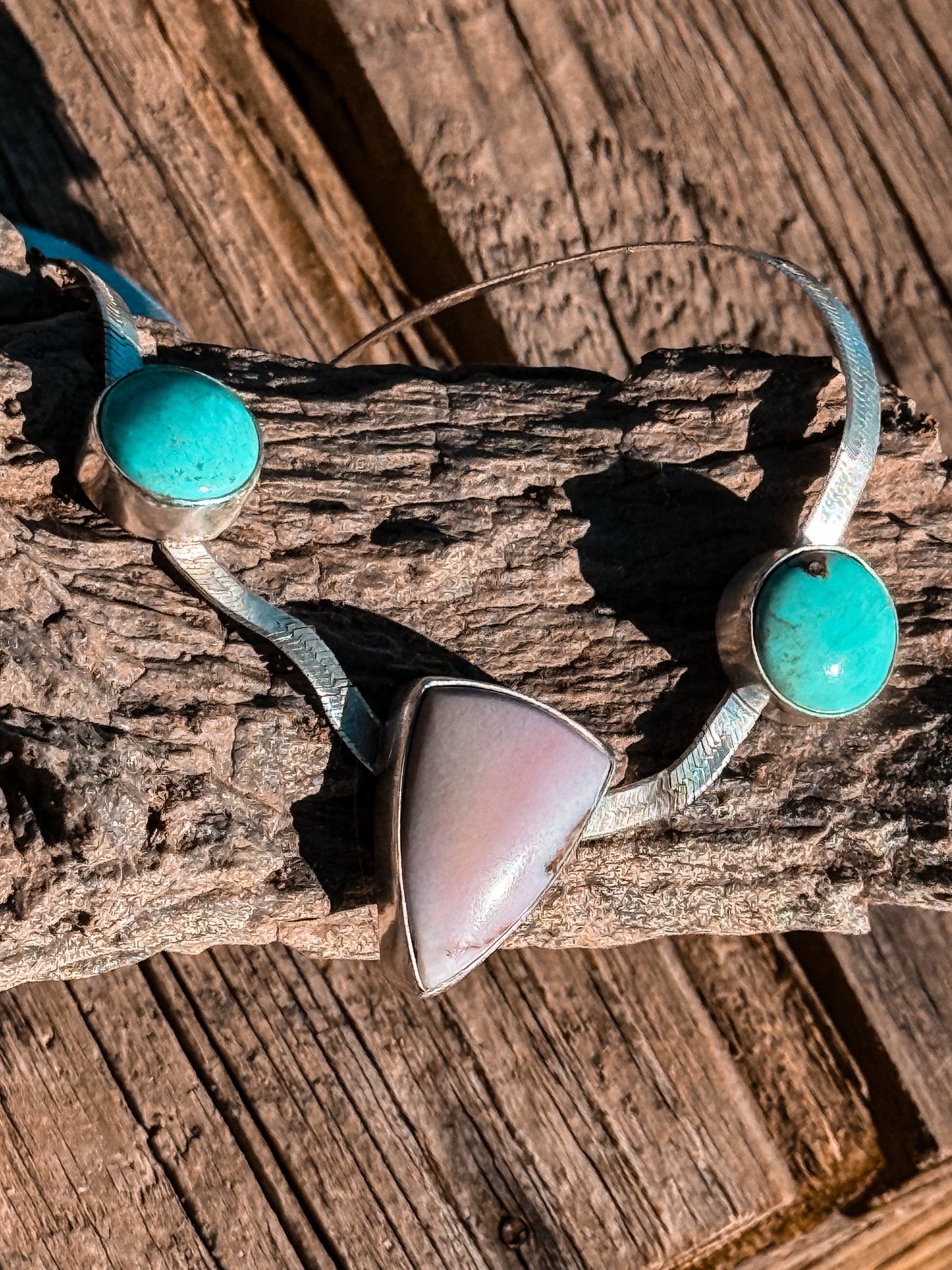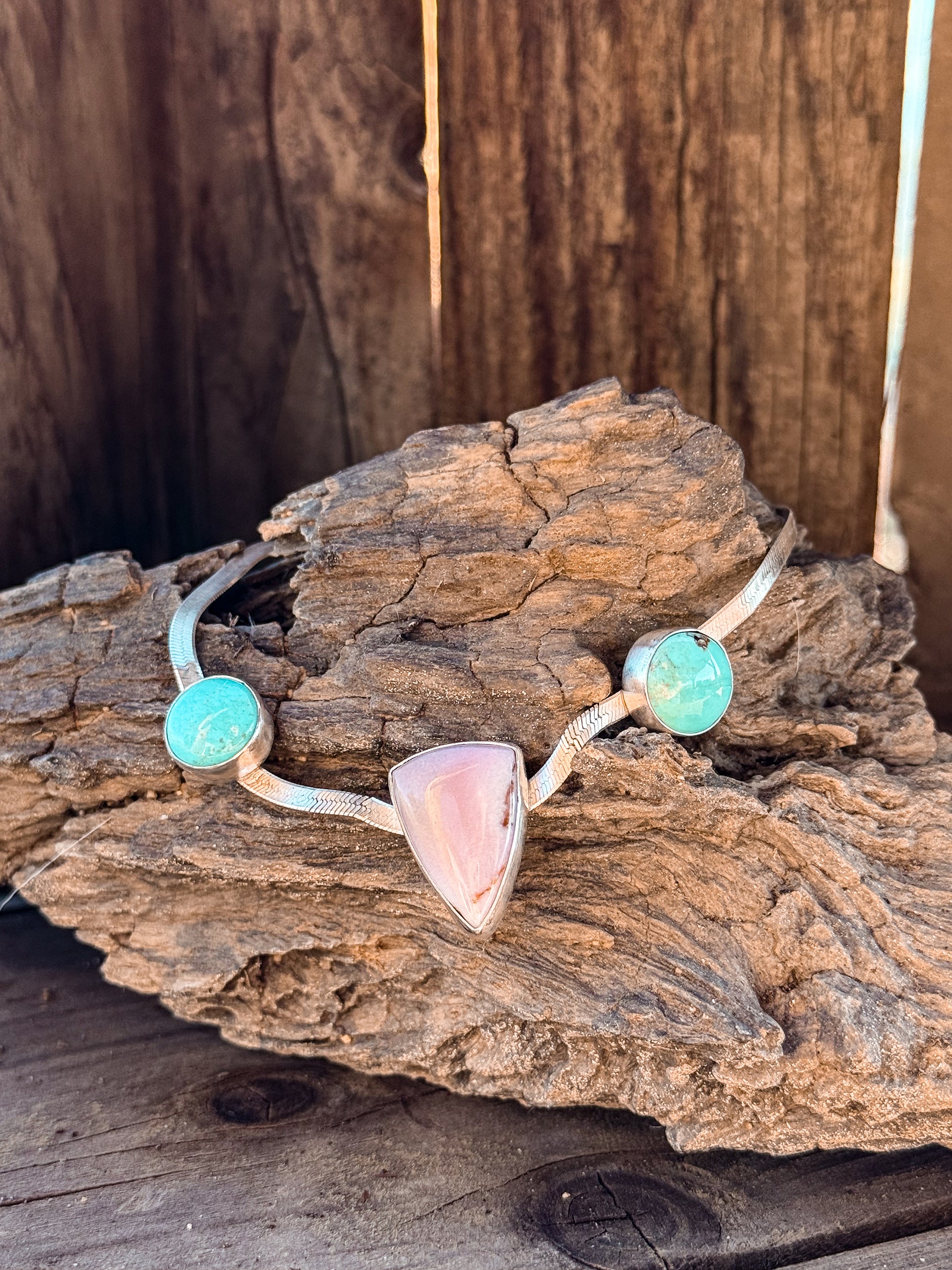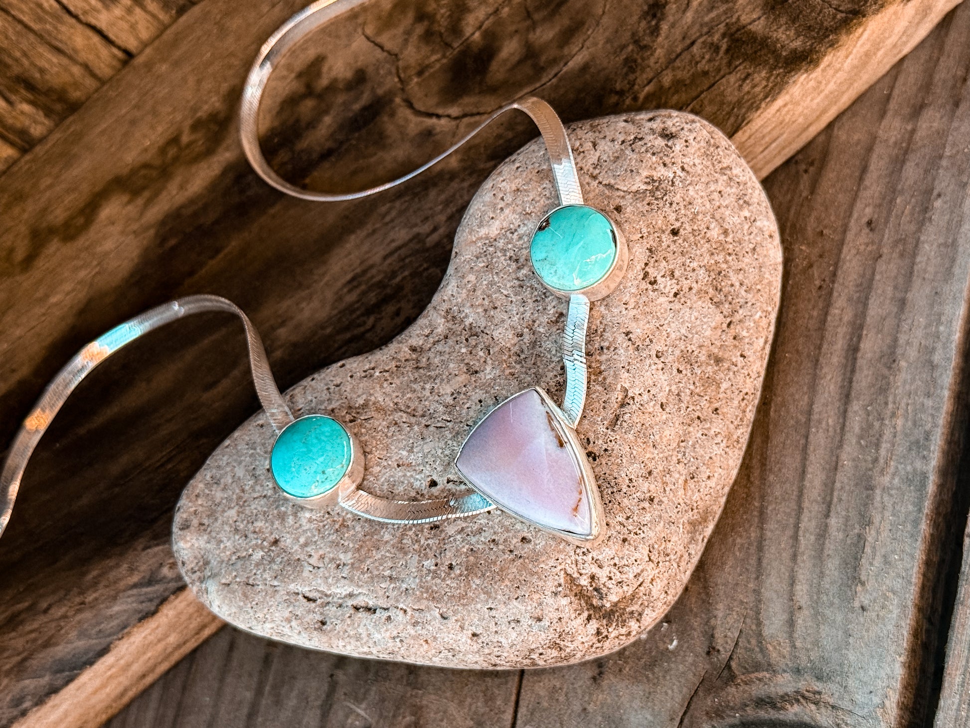 16in Italian made sterling silver snake chain adorn with a gorgeous soft Oregon Sunset Jasper centered between two #8 Mine Turquoise stones. Simple yet elegant a subtle statement piece perfect for wearing alone or stacking.