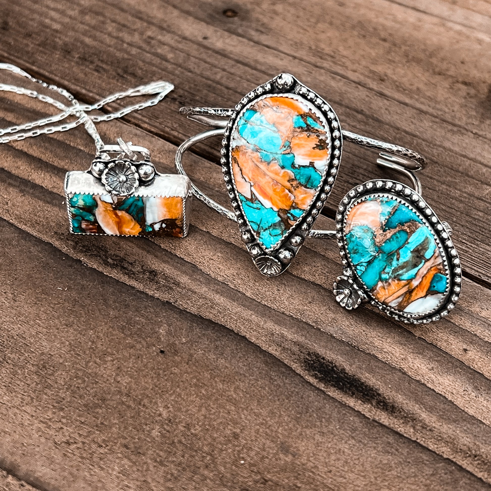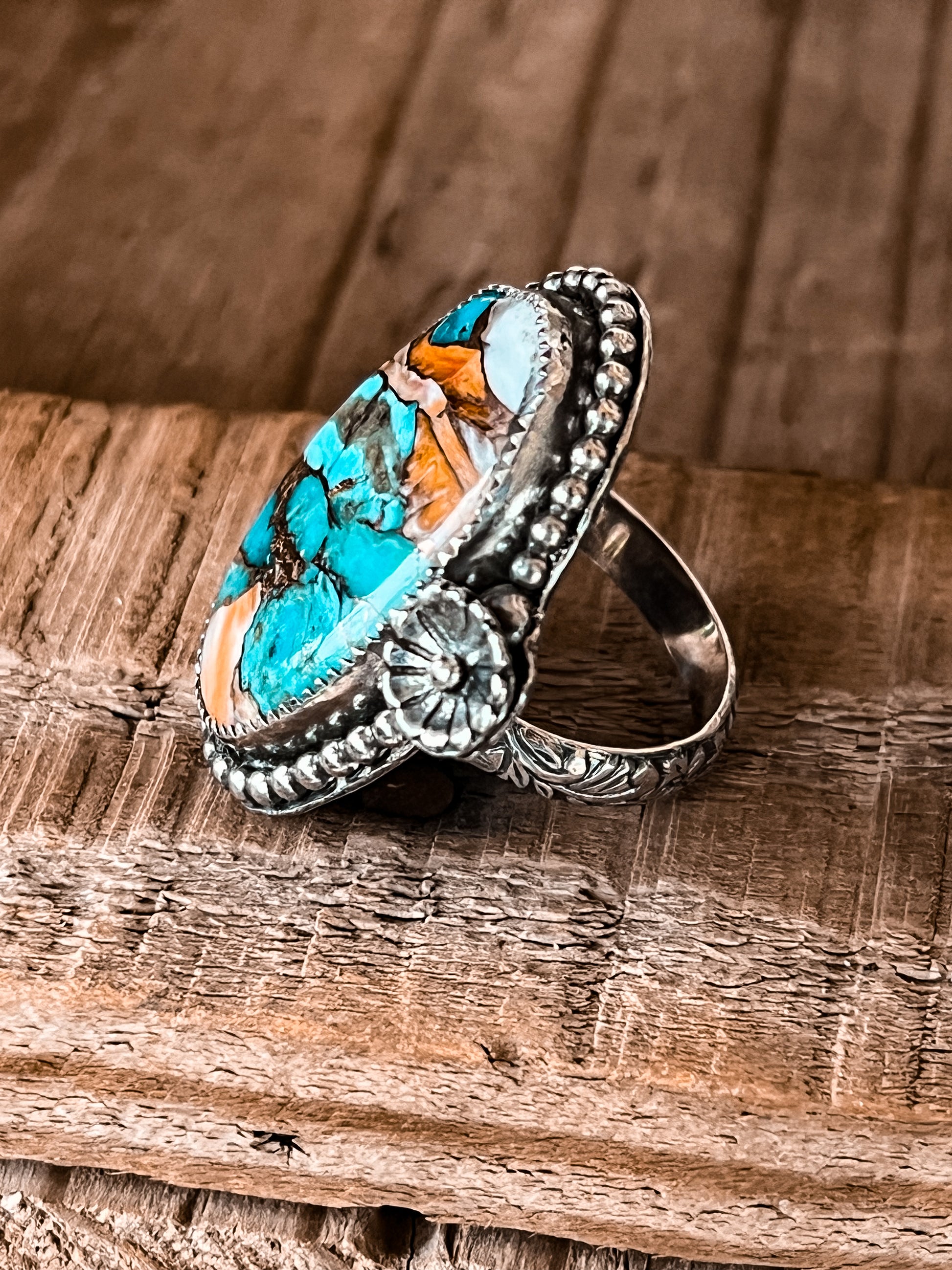 Spiny Kingman Turquoise and Sterling Silver Ring with Adjustable Floral Pattered Band. currently set to size 6.5. Can easily be adjusted up to an 8 or down to a 5.