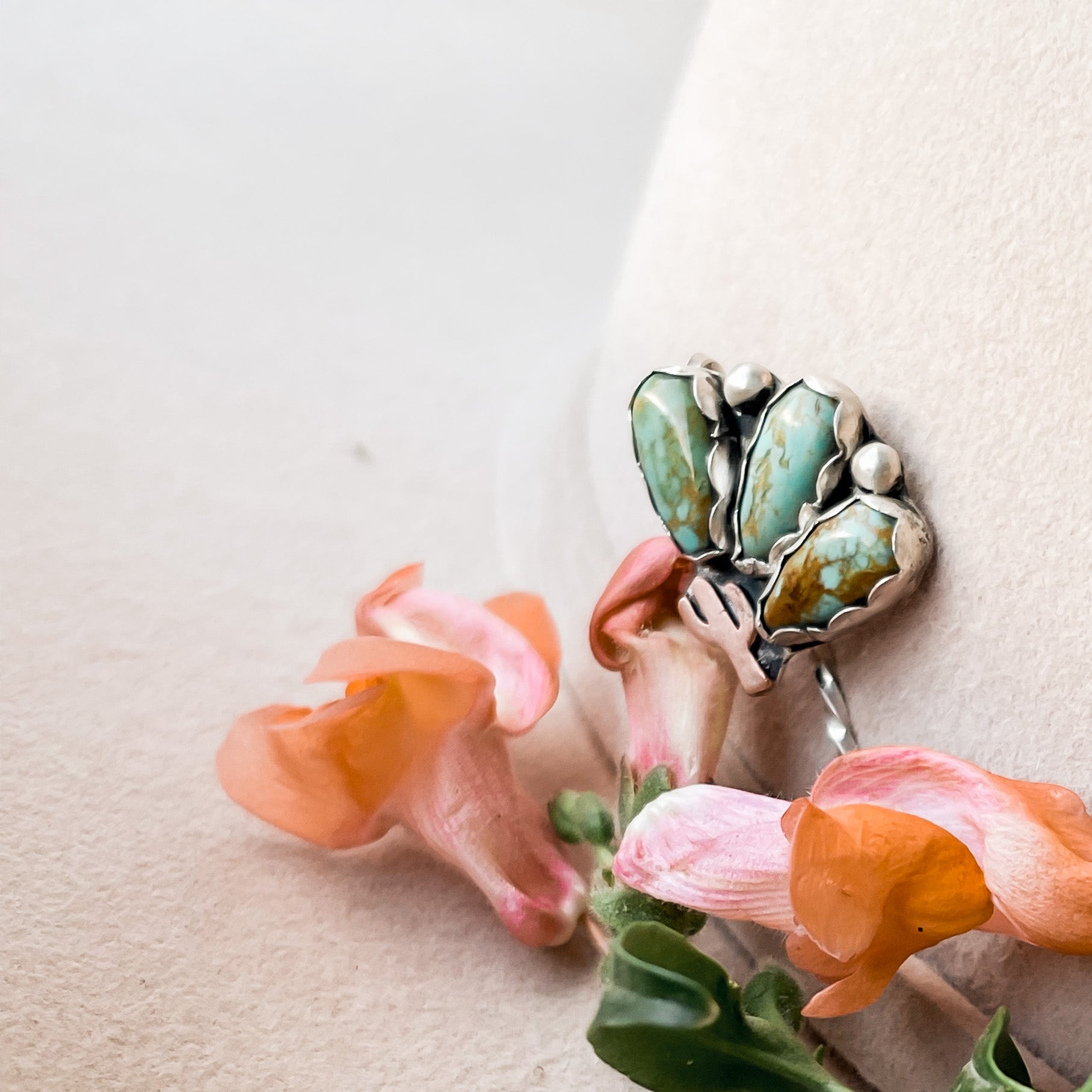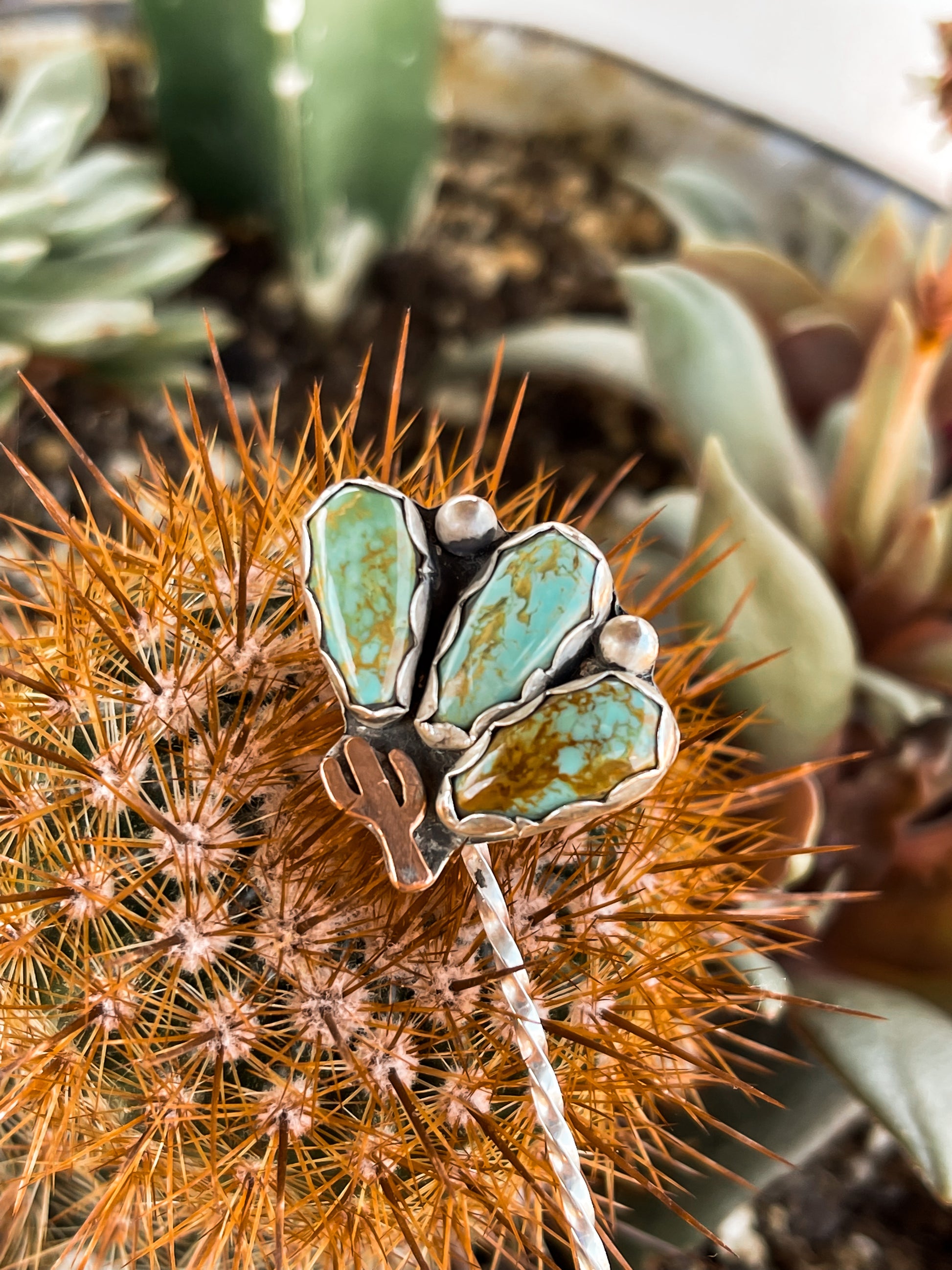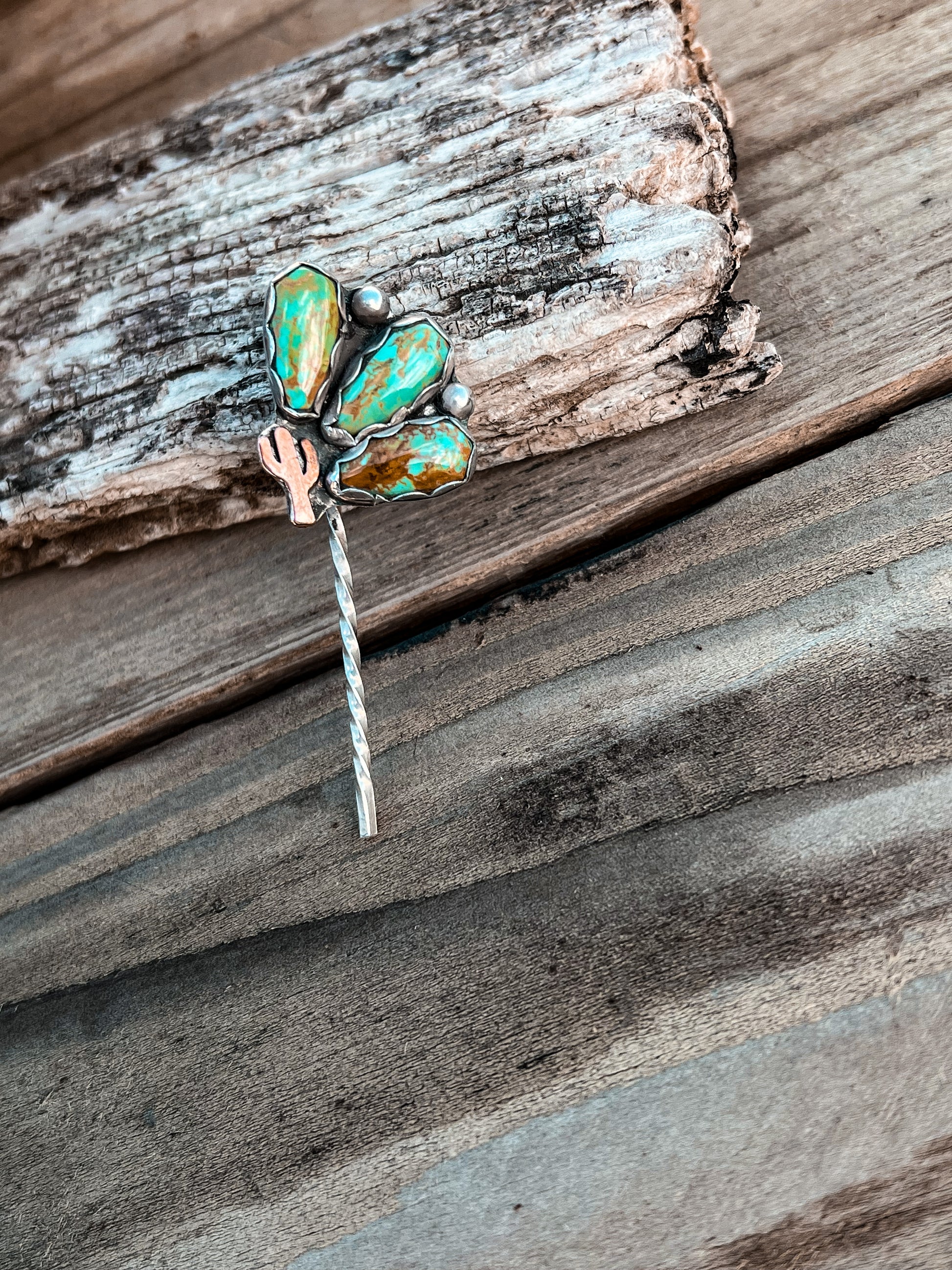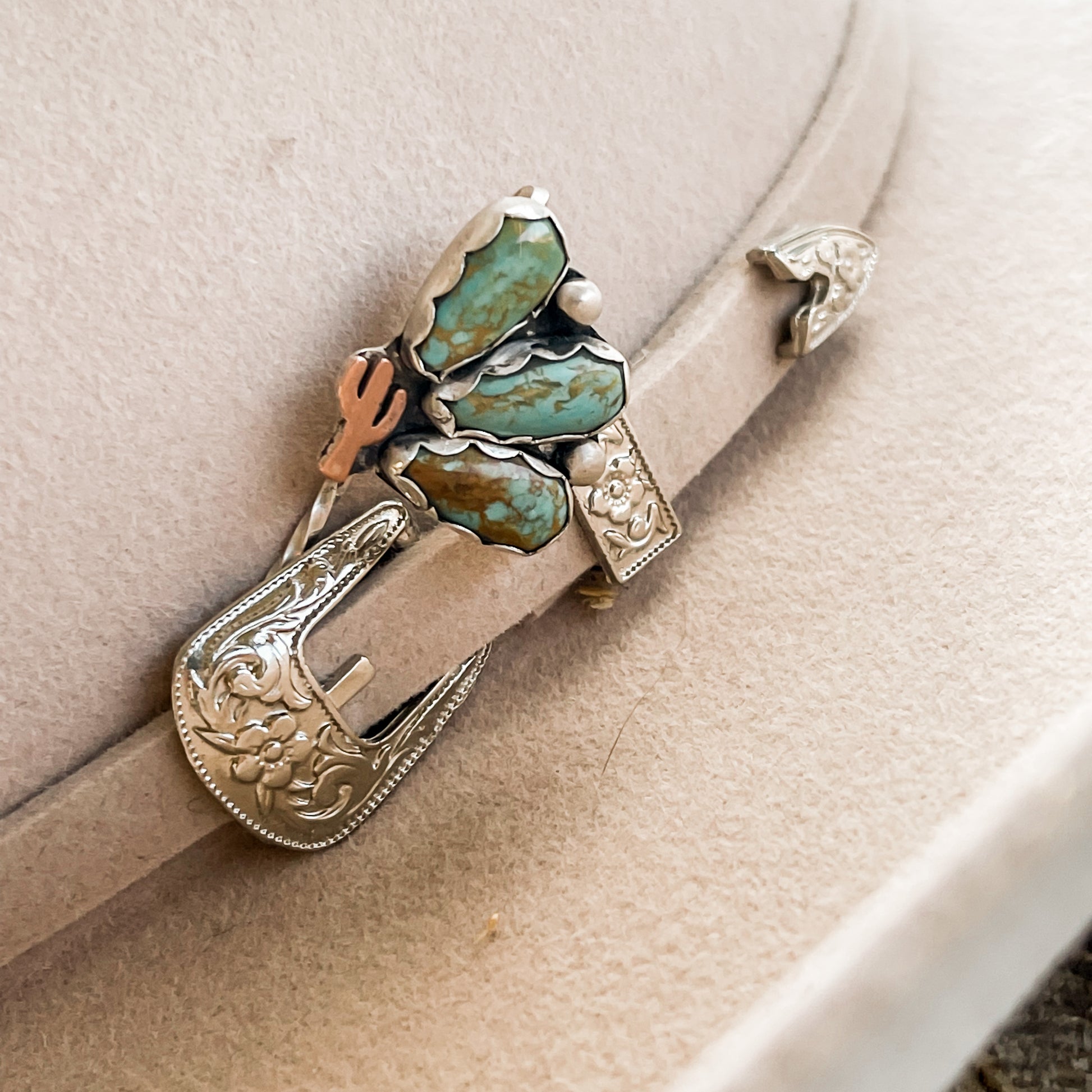 Dress up your hatband with this Tyrone turquoise with silver accents and a copper cactus and twisted wire hook.