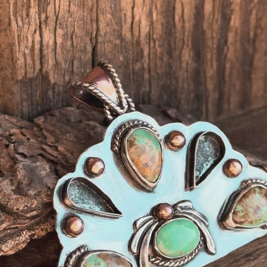 2 1/4” X 2” (including bail) Sterling Silver, Copper & Turquoise pendant. This would look amazing on 3mm pearls.